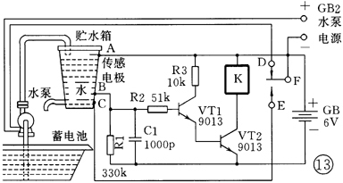 |   通常利用水塔向用户自来水龙头供水,而水塔则需要利用水泵向贮水箱不断补充水,水多了会溢出,少了供水又会中断,这就需要水位自动控制装置。小水塔水位自动控制电路 见图13。它由水位传感电极、控制电路、电动机(小离心水泵用)和电源等组成。控制电路由VT1、VT2和继电器K等组成。当水箱缺水时,水面低于B点,水位传感电极A—B、B—C之间由于没有被水淹没而开路,VT1、VT2截止,继电器呈释放状态,继电器衔铁F与常闭触点D接触,接通水泵电源GB2,小离心水泵电动机启动,向贮水箱供水。当水位上升至A点,水位传感电极A—B之间被水淹没,产生偏置电流使得VT1、VT2导通,继电器吸合,常闭触点断开,小离心水泵停止供水。此时,继电器衔铁F与常开触点E相触,电源通过继电器接通的常开触点F-E以及C—B之间能微弱导电的水,继续产生维持VT1、VT2导通所需的偏置电流,继电器吸合。自控电路直到水位降至B点以下时,C—B之间开路,VT1、VT2截止,继电器释放,常闭触点接通,小离心水泵开始供水。如此周而复始,完成水位自动控制作用。